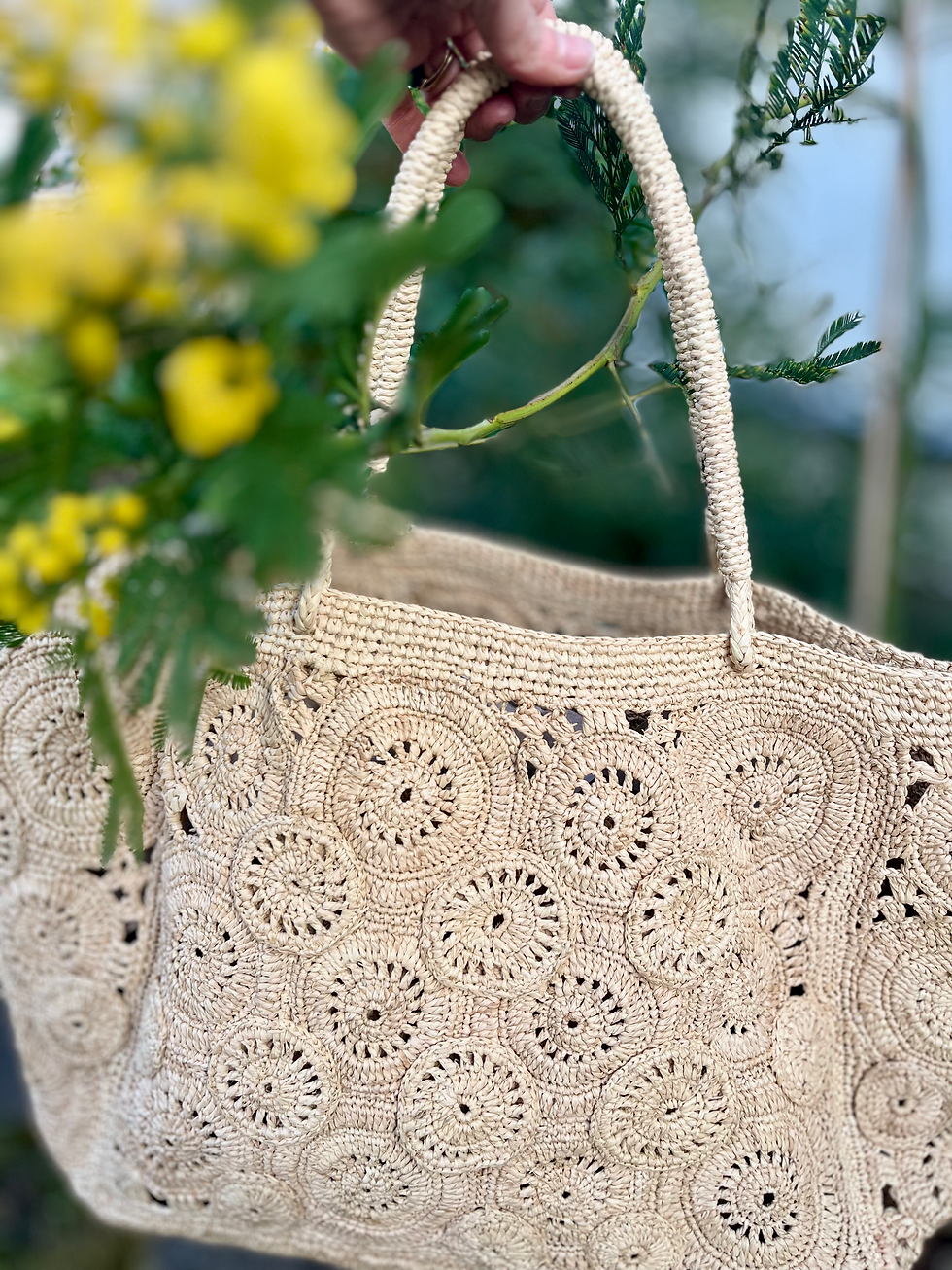 Cabas fleurs en raphia naturel et 1 fleur jaune